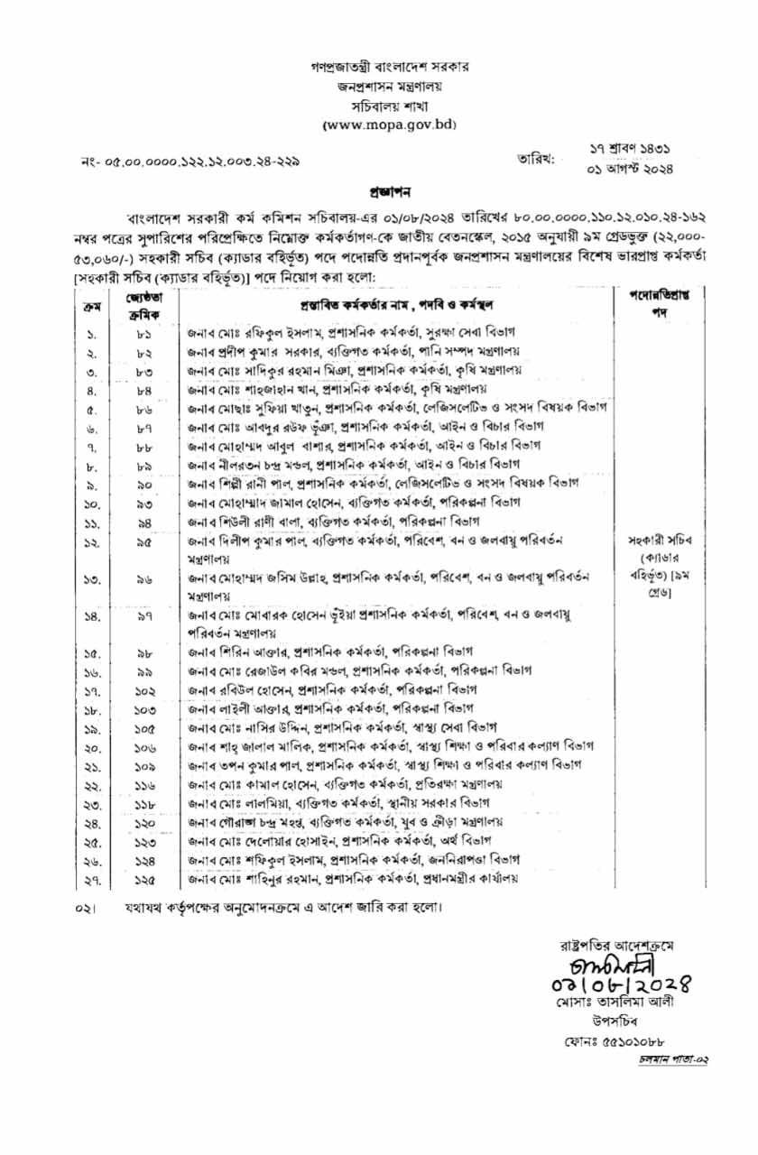 প্রজ্ঞাপনে বলা হয়, এসব কর্মকর্তাকে সহকারী সচিব (ক্যাডার বহির্ভূত) পদে পদোন্নতি দিয়ে জনপ্রশাসন মন্ত্রণালয়ের বিশেষ ভারপ্রাপ্ত কর্মকর্তা পদে নিয়োগ করা হলো। নিয়মানুযায়ী পরে তাদের পদায়ন করা হবে।