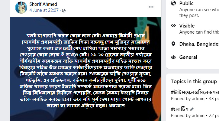 তিনি এক ফেসবুক পোস্টে লিখেছেন-যতই চাপাচাপি করুন কোন লাভ নেই! একমাত্র নির্বাহী প্রধান (মাননীয় প্রধানমন্ত্রী) জাতির পিতা বঙ্গবন্ধু শেখ মুজিবুর রহমানের সুযোগ্য কন্যা জননেত্রী শেখ হাসিনা ছাড়া সমস্যার সমাধান দেওয়ার কোন লোক ঐ ভূখণ্ডে নেই। ১১-২০ গ্রেডের জাতীয় পর্যায়ের শীর্ষস্থানীয় কয়েকজন ব্যক্তি মাননীয় প্রধানমন্ত্রীর সহিত সাক্ষাৎ করে বিনয়ের সহিত উক্ত গ্রেডের কর্মচারীদেরকে শুভঙ্করের ফাঁকি দেওয়ার বিষয়টি তাঁকে অবগত করতে হবে। শুভঙ্করের ফাঁকি দেওয়ার সূচনা, পটভূমি, এর প্রতিফলন, বর্তমান কর্মচারীদের দুর্দশা, দুর্নীতিতে জড়িত থাকার কারণ ইত্যাদি সম্পর্কে আলোকপাত করতে হবে। ভিন্ন ভিন্ন বিধিমালার ভিত্তিতে পদোন্নতি, বেতন বৈষম্য ইত্যাদি বিষয়ে তাঁকে অবহিত করতে হবে। তবে যদি সূর্য দেখা যায়। পোস্ট আপনার ভালো না লাগলে এড়িয়ে চলুন। ধন্যবাদ