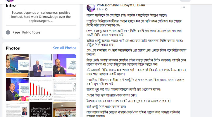 শনিবার (৩ জুলাই) তিনি ফেসবুকে এক পোষ্টে বলেন, আগামীতে মার্কেট অনেক ভাল হবে। তাই অযথা পেনিকড হয়ে শেয়ার বিক্রি করে লোকসান করবেন কেন? একই সাথে মার্কেটে দীর্ঘ মেয়াদে বিনিয়োগ করার আহ্বান জানান তিনি।