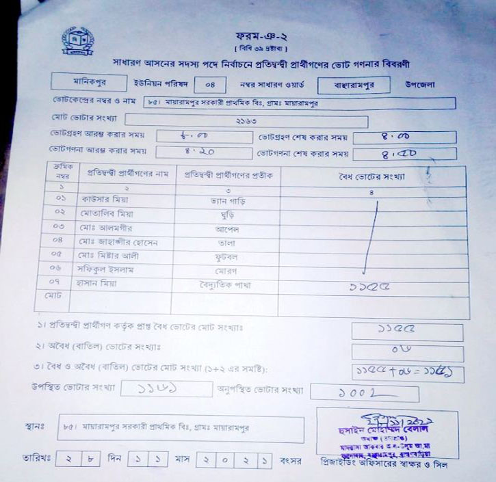 ৪ নম্বর ওয়ার্ডে একমাত্র ভোটকেন্দ্র মায়ারামপুর সরকারি প্রাথমিক বিদ্যালয়। এই ভোটকেন্দ্রের মোট ভোটার সংখ্যা দুই হাজার ১৬৩। এ কেন্দ্রে ভোট দিয়েছেন এক হাজার ১৬১ জন ভোটার। এর মধ্যে বৈধ ভোট দেখানো হয়েছে এক হাজার ১৫৫টি। আর বাতিলকৃত ভোট সংখ্যা ছয়টি। তবে বৈধ এক হাজার ১৫৫টি ভোটের সবকটিই হাসান মিয়া ওরফে কাজী সালাউদ্দিনের বৈদ্যুতিক পাখা প্রতীকে পড়েছে বলে প্রিসাইডিং অফিসার স্বাক্ষরিত ফলাফল শিটে উল্লেখ করা হয়েছে।