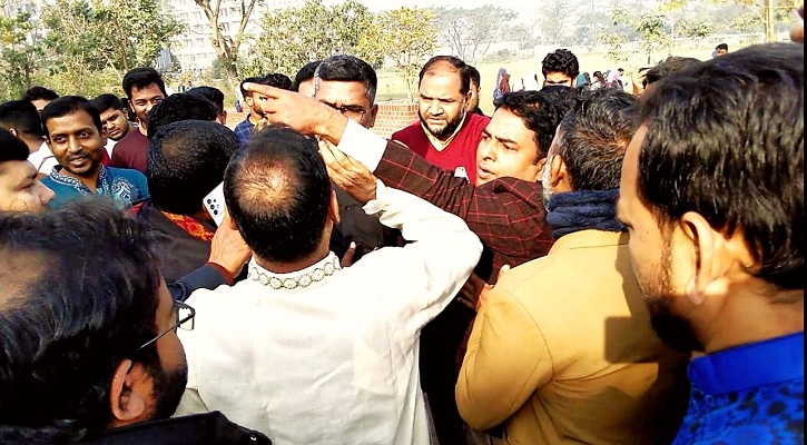 বুধবার (২১ ফেব্রুয়ারি) সকাল সোয়া ৮টার দিকে বিশ্ববিদ্যালয় চত্তরের শহীদ মিনারের সামনে এ ঘটনা ঘটে। ঘটনার সুষ্ঠু বিচার ও নিরাপত্তা চেয়ে বিশ্ববিদ্যালয়ের রেজিস্ট্রার বরাবর লিখিত অভিযোগ দিয়েছেন ভুক্তভোগী পক্ষ।