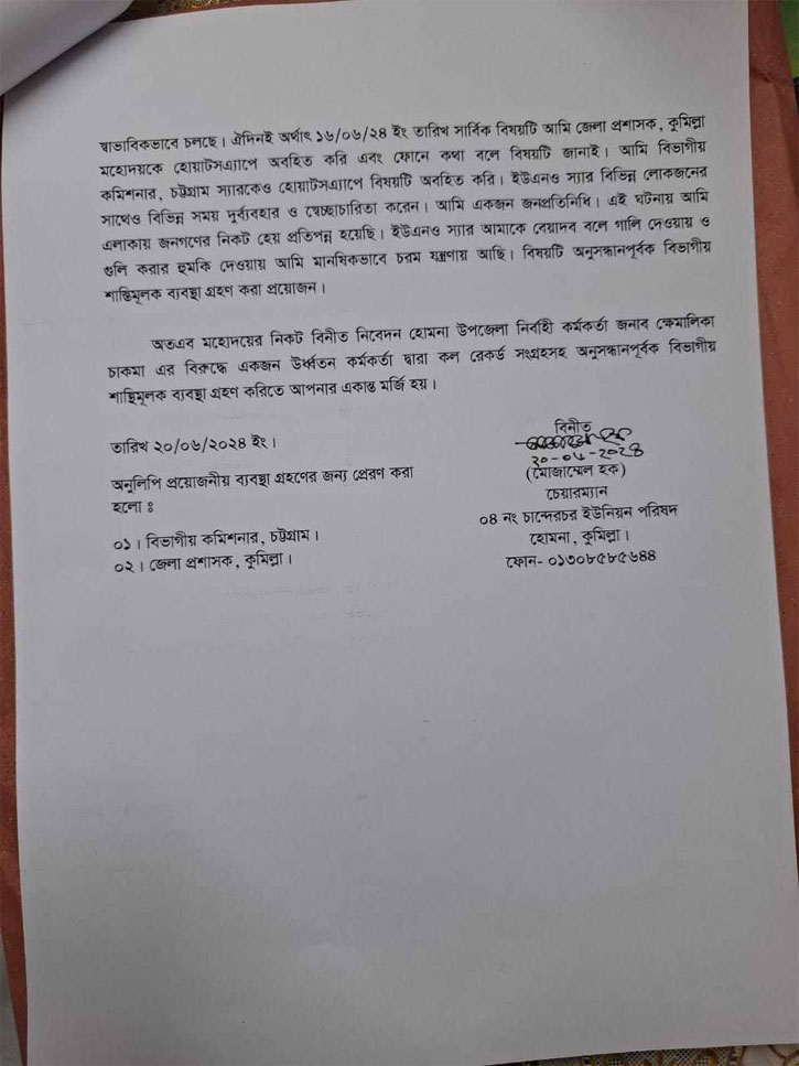 চান্দের চর ইউনিয়ন পরিষদের চেয়ারম্যান মোজাম্মেল হক জনপ্রশাসন মন্ত্রণালয়ের সচিব বরাবর এবিষয়ে একটি লিখিত অভিযোগ করেছেন।