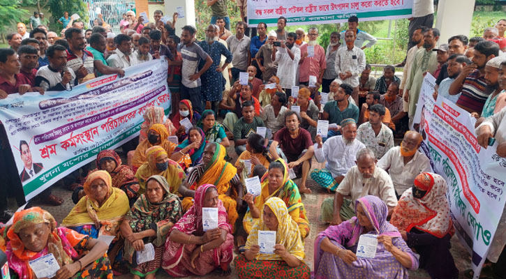 খুলনা: বেশ কয়েকটি দাবি নিয়ে শ্রম অধিদপ্তর, শ্রম ও কর্মসংস্থান মন্ত্রণালয় ঘেরাও কর্মসূচি পালন করেছে খুলনায় পাটকলের শ্রমিকেরা।