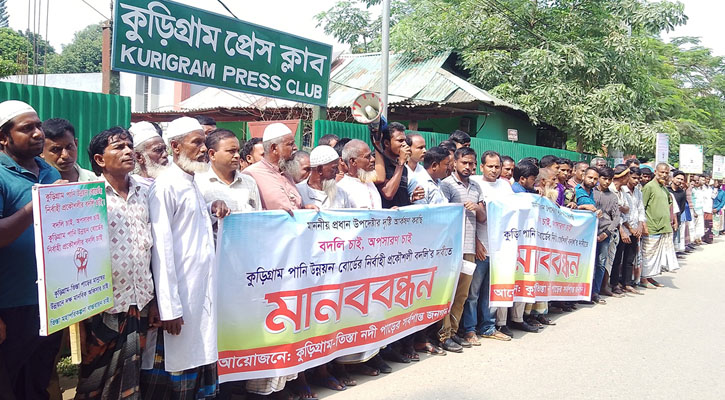কুড়িগ্রাম: তিস্তার ভাঙ্গনরোধে ব্যবস্থা না নেয়ায় কুড়িগ্রাম পানি উন্নয়ন বোর্ডের নির্বাহী প্রকৌশলীকে বদলীর দাবিতে মানববন্ধন করেছে তিস্তাপাড়ের মানুষ।
