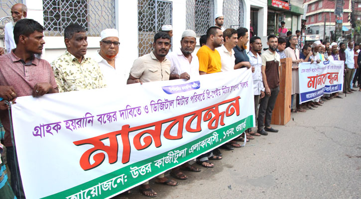 সিলেট: সিলেটে গ্রাহক হয়রানি বন্ধ করতে ও ডিজিটাল মিটারের পরিবর্তে প্রি-পেইড মিটার স্থাপনের বিরুদ্ধে মানববন্ধন অনুষ্ঠিত হয়েছে। মঙ্গলবার (৫ নভেম্বর) বিকেলে নগরের উত্তর কাজিটুলা জামে মসজিদের সামনে ৫ ও ১৭ নং ওয়ার্ডের কলবাখানী ও উত্তর কাজীটুলা এলাকাবাসীর উদ্যোগে এই মানববন্ধনের আয়োজন করা হয়।