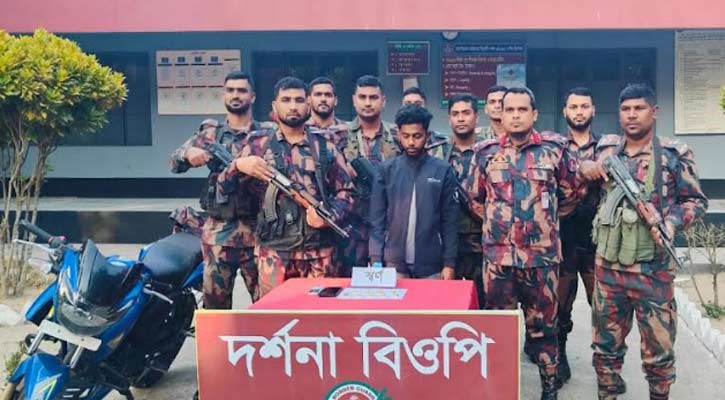 পরে তার ব্যবহৃত মোটরসাইকেলটি তল্লাশি করে মোটরসাইকেলের হেড লাইটের কভারের মধ্যে কালো স্কচটেপ দ্বারা মোড়ানো অবস্থায় আনুমানিক ১ কেজি ১৭৮ গ্রাম ওজনের ৯ টি স্বর্ণের বার উদ্ধার করে। আটককৃত আসামীকে দর্শনা থানায় হস্তান্তর পূর্বক জব্দকৃত স্বর্ণের বারগুলি চুয়াডাঙ্গা ট্রেজারী অফিসে জমা করার কার্যক্রম প্রক্রিয়াধীন রয়েছে।