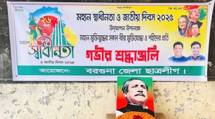 বরগুনা জেলা ছাত্রলীগের ব্যানারে শেখ মজিবুর রহমানের ছবি সম্মলিত একটি শ্রদ্ধাঞ্জলি পুষ্পমাল্য অর্পণ করা ছবি ও ব্যানার দেখা যায় জাতীয় দিবস পালনে।