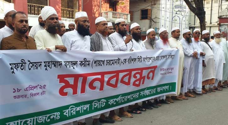 বরিশাল: সিটি করপোরেশনের ২০২৩ সালের নির্বাচনের ফলাফল বাতিল করে ইসলামী আন্দোলন বাংলাদেশের নায়েবে আমির মুফতি সৈয়দ মুহাম্মদ ফয়জুল করিমকে মেয়র হিসেবে ঘোষণা করার দাবিতে বরিশালে মানববন্ধন অনুষ্ঠিত হয়েছে।