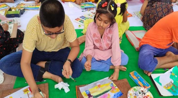 আবার কারও চিত্রে ধরা পড়ছে সোনালি ধানের খেত কিংবা ঘামে ভেজা কৃষকের মুখ। শিশুর চোখে গ্রামের প্রকৃতি ধরা দিচ্ছে এক অপূর্ব রঙে, এক স্বতঃস্ফূর্ত ভঙ্গিতে।