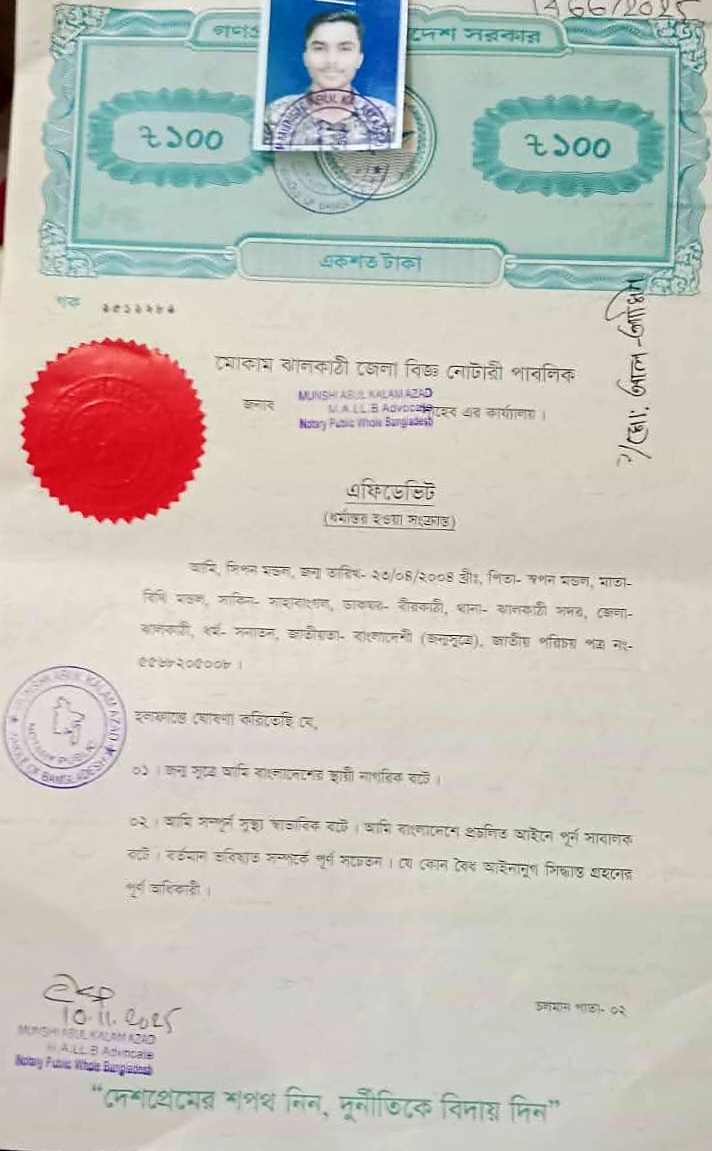 এ বিষয়ে তিনি ঝালকাঠি জেলা নোটারি পাবলিকের মাধ্যমে এফিডেভিটনামা সম্পন্ন করেছেন।