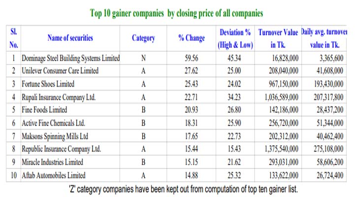 দর বাড়ার তালিকায় থাকা অন্যান্য কোম্পানিগুলো মধ্যে দ্বিতীয় স্থানে রয়েছে- ইউনিলিভার কনজুমার কেয়ার লিমিটেড, তৃতীয় স্থানে ফরচুন সুজ লিমিটেড, চতুর্থ স্থানে রূপালী ইন্ডাস্ট্রিজ কোম্পানি লিমিটড, পঞ্চম স্থানে ফাইন ফুডস লিমিটেড, স্থানে রয়েছে এক্সিভ ফাইন কেমিক্যালস লিমিটেড, সপ্তাম স্থানে ম্যাকসন্স স্পিনিং মিলস্ লিমিটেড, অষ্টম স্থানে রূপালি ইস্যুরেন্স লিমিটেড, নবম স্থানে মিরাকল ইন্ডাস্ট্রিজ লিমিটেড এবং দশম স্থানে রয়েছে আফতাব অটোমোবাইলস লিমিটেড।
