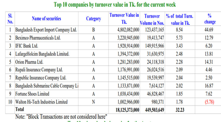 ঢাকা : ঢাকা স্টক এক্সচেঞ্জে (ডিএসই) গত সপ্তাহে লেনদেন বাড়ার শীর্ষ ১০ কোম্পানির তালিকার মধ্যে প্রথমে উঠে এসেছে বাংলাদেশ এক্সপোর্ট ইমপোর্ট কোম্পানি লিমিটেড (বেক্সিমকো)।