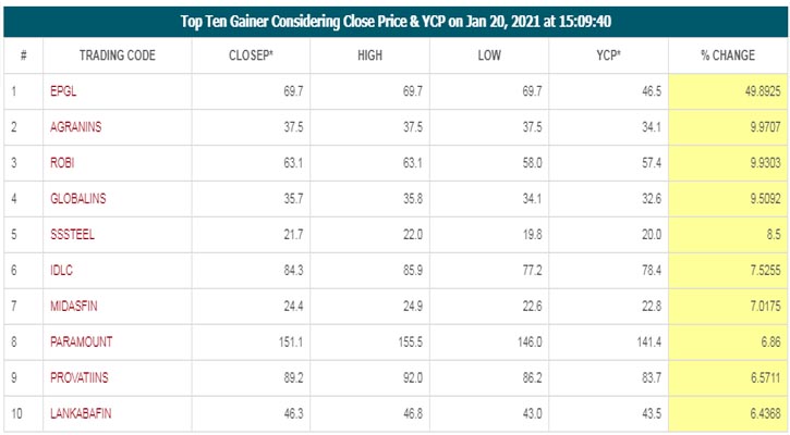 তালিকার কোম্পানিগুলোর মধ্যে চতুর্থ অবস্থানে থাকা গ্লোবাল ইন্স্যুরেন্সের দর বড়েছে ৯ দশমিক ৫০ শতাংশ, পঞ্চম স্থানে থাকা এসএস স্টিলের ৮ দশমি ৫০ শতাংশ, ষষ্ঠ স্থানে থাকা আইডিএলসির ৭ দশমিক ৫২ শতাংশ, সপ্তম স্থানে থাকা মাইডাস ফাইন্যান্সিংয়ের ৭ দশমিক ০১ শতাংশ, অষ্টম স্থানে থাকা প্যারামাউন্ট ইন্স্যুরেন্সের ৬ দশমিক ৮৬ শতাংশ, নবম স্থানে থাকা প্রভাতী ইন্স্যুরেন্সের ৬ দশমিক ৫৭ শতাংশ এবং দশম স্থানে থাকা লংকাবাংলা ফাইন্যান্সের শেয়ার দর ৬ দশমিক ৪৩ শতাংশ বেড়েছে।
