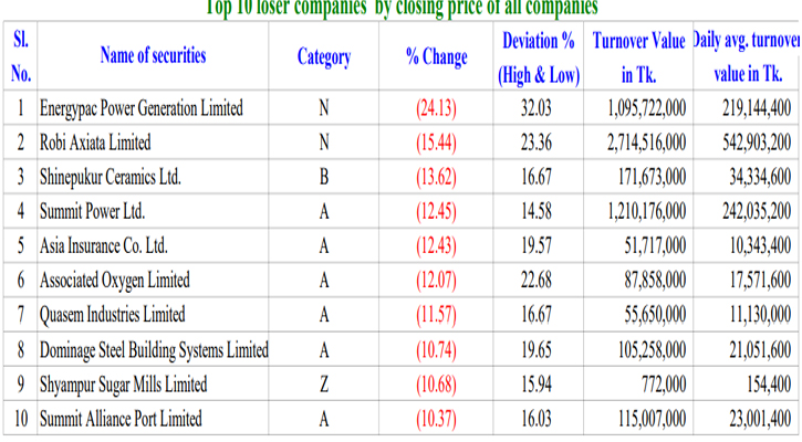 তালিকার অন্যান্য কোম্পানিগুলোর মধ্যে চতুর্থ অবস্থানে থাকা সামিট পাওয়ার লিমিটেড এর ১২ দশমিক ৪৫ শতাংশ, পঞ্চম স্থানে থাকা এশিয়া ইন্স্যুরেন্স কোম্পানি লিমিটেড এর ১২ দশমিক ৪৩ শতাংশ, ষষ্ঠ স্থানে থাকা এসোসিয়েটেড অক্সিজেন লিমিটেড এর ১২ দশমিক ৭ শতাংশ, সপ্তম স্থানে থাকা কাশেম ইন্ডাস্ট্রিজ লিমিটেড এর ১১ দশমিক ৫৭ শতাংশ, অষ্টম স্থানে থাকা ডমিনেজ স্টিল বিল্ডিং সিস্টেমস লিমিটেড এর ১০ দশমিক ৭৪ শতাংশ, নবম স্থানে থাকা শ্যামপুর সুগার মিলস লিমিটেড এর ১০ দশমিক ৬৮ শতাংশ এবং দশম স্থানে থাকা সামিট এলায়েন্স পোর্ট লিমিটেড এর দর কমেছে ১০ দশমিক ৩৭ শতাংশ।