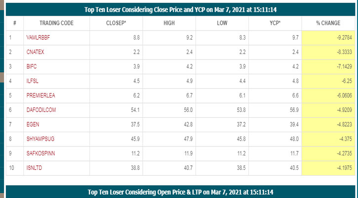 পতনের তালিকায় চতুর্থ স্থানে থাকা ইন্টারন্যাশনাল লিজিং এন্ড ফাইন্যানশিয়াল সার্ভিসে লিমিটেড এর দর কমেছে ৬ দশমিক ২৫ শতাংশ, পঞ্চম স্থানে থাকা প্রিমিয়ার লিজিং এন্ড ফাইন্যান্স লিমিটেড এর ৬ দশমিক ০৬ শতাংশ, ষষ্ঠ স্থানে থাকা ডেফোডিল কম্পিউটারস লিমিটেড এর ৪ দশমিক ৯২ শতাংশ, সপ্তম স্থানে থাকা ই-জেনারেশন লিমিটেড এর ৪ দশমিক ৮২ শতাংশ, অষ্টম স্থানে থাকা শ্যাম্পুর সুগার মিলস লিমিটেড এর ৪ দশমিক ৩০ শতাংশ, নবম স্থানে থাকা সাফকো স্পিনিং মিলস লিমিটেড এর ৪ দশমিক ২৭ শতাংশ এবং দশম স্থানে থাকা ইনফরমেশন সার্ভিসেস নেটওয়ার্ক লিমিটেড এর শেয়ার দর ৪ দশমিক ১৯ শতাংশ দর কমেছে।