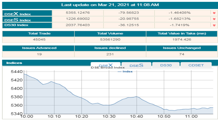 ডিএসই সূত্রে জানা গেছে, ডিএসই'র ব্রড ইনডেক্স এসময় ৮৩ পয়েন্ট কমে দাঁড়িয়েছে ৫ হাজার ৩৫১ পয়েন্টে। আর ডিএসই শরিয়াহ সূচক ২২ পয়েন্ট কমে হয়েছে ১ হাজার ২২৫ পয়েন্ট এবং ডিএসই-৩০ সূচক ৩৭ পয়েন্ট কমে দাঁড়ায় ২ হাজার ০৩৬ পয়েন্টে।