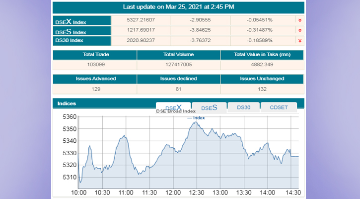 জানা যায়, ডিএসই'র ব্রড ইনডেক্স এদিন ২ পয়েন্ট কমে দাঁড়িয়েছে ৫ হাজার ৩২৭ পয়েন্টে। আর ডিএসই শরিয়াহ সূচক ৩ পয়েন্ট কমে হয়েছে ১ হাজার ২১৭ পয়েন্ট এবং ডিএসই-৩০ সূচক ৩ পয়েন্ট কমে দাঁড়ায় ২ হাজার ২০ পয়েন্টে।