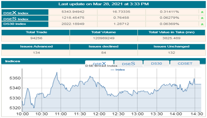 জানা গেছে, ডিএসই ব্রড ইনডেক্স আজ ১৬ পয়েন্ট বেড়ে অবস্থান করছে ৫ হাজার ৩৪৩ পয়েন্টে। আর ডিএসই শরিয়াহ সূচক শূণ্য দশমিক ৭৬ পয়েন্ট বেড়ে অবস্থান করছে ১ হাজার ২১৮ পয়েন্টে এবং ডিএসই–৩০ সূচক ১ পয়েন্ট বেড়ে অবস্থান করছে ২ হাজার ২২ পয়েন্টে।