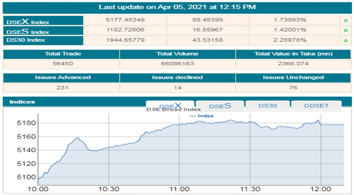 ঢাকা: সারাদেশে আজ ৫ এপ্রিল থেকে ১২ এপ্রিল পর্যন্ত লকডাউন ঘোষণা করেছে সরকার। এদিকে লকডাউনের জন্য শেয়ারবাজারে লেনদেনের সময়ও ২ ঘন্টা কমিয়ে সকাল ১০টা থেকে দুপুর ১২টা পর্যন্ত করা হয়েছে। সল্প সময়ের লেনদেনের প্রথম দিনে আজ সূচকের ঊর্ধ্বমূখী প্রবণতা দেখা গেছে।
