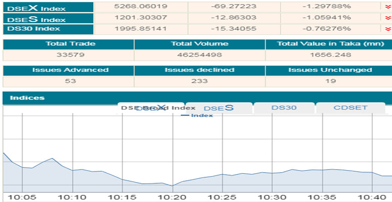 দেখা যায়, ডিএসই’র ব্রড ইনডেক্স এসময় ৬৯ পয়েন্ট কমে অবস্থান করছে ৫ হাজার ২৬৮ পয়েন্টে। আর ডিএসই শরিয়াহ সূচক ১২ পয়েন্ট কমে অবস্থান করছে ১ হাজার ২০১ পয়েন্টে এবং ডিএসই–৩০ সূচক ১৫ পয়েন্ট কমে অবস্থান করছে ১ হাজার ৯শ’ ৯৫ পয়েন্টে।