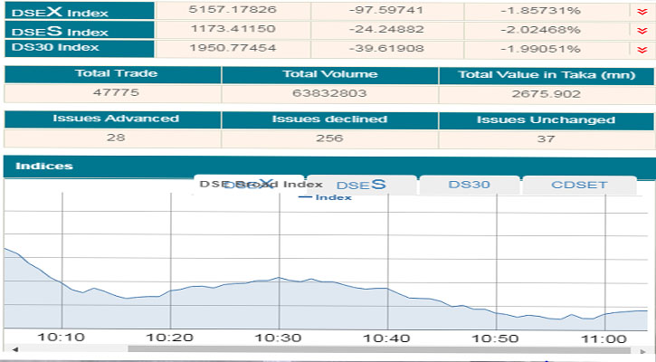 দেশের প্রধান শেয়াবাজার ঢাকা স্টক এক্সচেঞ্জে (ডিএসই) এদিন বেলা ১১টা পর্যন্ত সূচকের পাশাপাশি কমেছে বেশিরভাগ কোম্পানি ও মিউচ্যুয়াল ফান্ডের শেয়ার দরও।