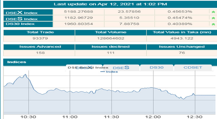 ঢাকা: সারাদেশে ৫ এপ্রিল থেকে ১১ এপ্রিল পর্যন্ত কঠোর বিধিনিষেধ শেষে আজ সোমবার ও আগামীকাল মঙ্গলবার ব্যাংকের সংঙ্গে সম্পৃক্ততা রেখে অর্ধঘন্টা বাড়িয়ে দেশের শেয়ারবাজারের লেনদেনও সকাল ১০টা থেকে দুপুর সাড়ে ১২টা পর্যন্ত করা হয়েছে। আড়াই ঘন্টা লেনদেনের প্রথম দিনে এসে আজ সূচকের ঊর্ধ্বমূখী প্রবণতায় লেনদেন শেষ হয়েছে।