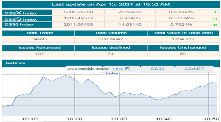 দেশের প্রধান শেয়াবাজার ঢাকা স্টক এক্সচেঞ্জে (ডিএসই) এদিন সকাল ১০টা ৫০ পর্যন্ত সূচকের পাশাপাশি বেড়েছে বেশিরভাগ কোম্পানি ও মিউচ্যুয়াল ফান্ডের শেয়ার দরও।