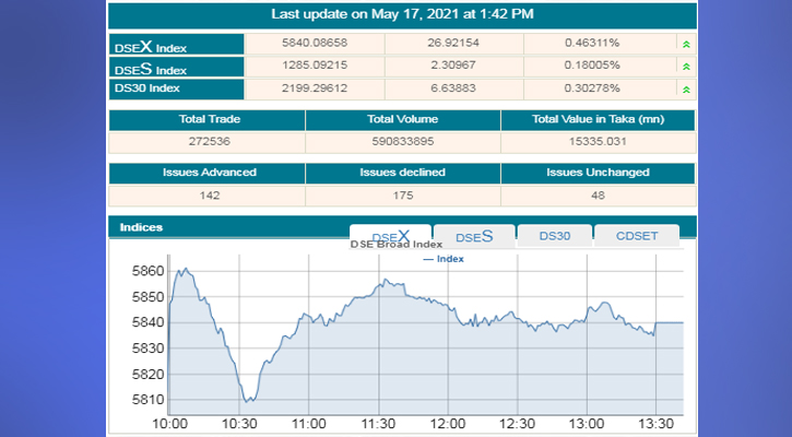 জানা গেছে, ডিএসই'র প্রধান সূচক ডিএসইএক্স এদিন ২৬ পয়েন্ট বেড়ে দাঁড়িয়েছে ৫ হাজার ৮৪০ পয়েন্টে। ডিএসই'র অপর সূচকগুলোর মধ্যে শরিয়াহ সূচক শূন্য দশমিক ২ পয়েন্ট বেড়ে ১ হাজার ২৮৫ পয়েন্টে এবং ডিএসই-৩০ সূচক ৬ পয়েন্ট বেড়ে দাঁড়িয়েছে ২ হাজার ১৯৯ পয়েন্টে।