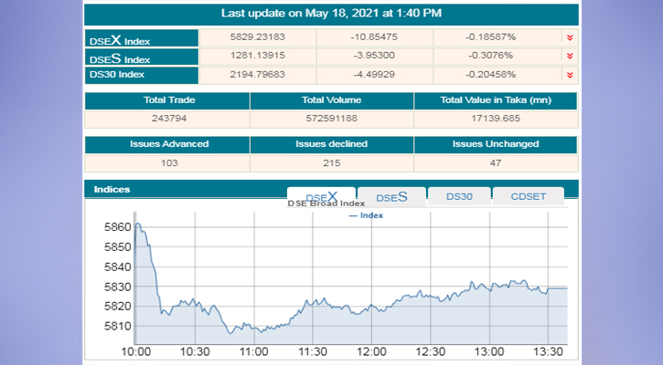 জানা গেছে, ডিএসই'র প্রধান সূচক ডিএসইএক্স এদিন ১০ পয়েন্ট কমে দাঁড়িয়েছে ৫ হাজার ৮২৯ পয়েন্টে। ডিএসই'র অপর সূচকগুলোর মধ্যে শরিয়াহ সূচক শূন্য দশমিক ৩ পয়েন্ট কমে ১ হাজার ২৮১ পয়েন্টে এবং ডিএসই-৩০ সূচক ৪ পয়েন্ট কমে দাঁড়িয়েছে ২ হাজার ১৯৪ পয়েন্টে।