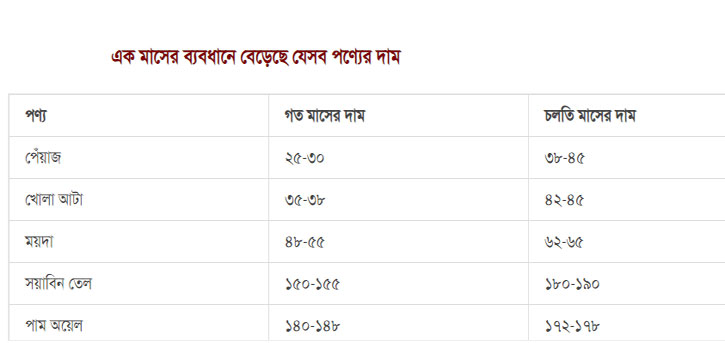 যেসব পণ্যের দাম বেড়েছে, সেগুলো সর্বনিম্ন দেড় শতাংশ থেকে সর্বোচ্চ প্রায় ৫১ শতাংশ পর্যন্ত বেড়েছে এই এক মাসের মধ্যেই। যার মধ্যে সবেচেয় বেশি বেড়েছে পেঁয়াজের দাম। এছাড়া বাজারে খোলা আটা-ময়দা, ভোজ্যতেল, মসুর ডাল, ডিম, আদা, রসুন ও আলুর দাম বেড়েছে ১০-২৯ শতাংশ পর্যন্ত। এ সব পণ্যই একটি পরিবারের জন্য প্রতিদিনের অপরিহার্য।