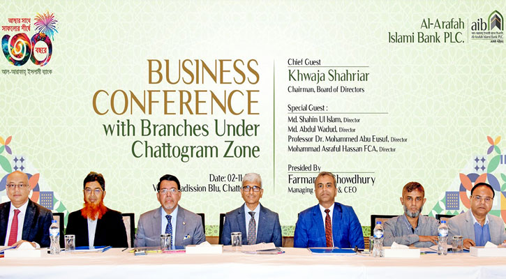 ঢাকা: আল-আরাফাহ ইসলামী ব্যাংক পিএলসি. এর চট্টগ্রাম জোনের শাখাসমূহের ব্যবসা পর্যালোচনা সম্মেলন অনুষ্ঠিত হয়েছে। শনিবার (২ নভেম্বর) শনিবার চট্টগ্রামের একটি হোটেলে এই সম্মেলন অনুষ্ঠিত হয়। ব্যাংকের পরিচালনা পর্ষদের চেয়ারম্যান খাজা শাহরিয়ার অনুষ্ঠানে প্রধান অতিথি হিসেবে উপস্থিত ছিলেন। ব্যবস্থাপনা পরিচালক ও সিইও ফরমান আর চৌধুরীর সভাপতিত্বে সম্মেলনে বিশেষ হিসেবে ছিলেন ব্যাংকের পরিচালক মোঃ শাহীন উল ইসলাম, মোঃ আব্দুল ওয়াদুদ, অধ্যাপক ড. এম আবু ইউসুফ এবং মোহাম্মদ আশরাফুল হাছান এফসিএ।