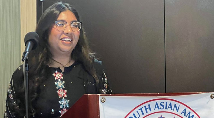 লং আইল্যান্ড চ্যাপ্টারের অভিষেক উৎসবে বক্তব্য দিচ্ছেন তনিকা শিকদার। ছবি-এনওয়াইভয়েস২৪।