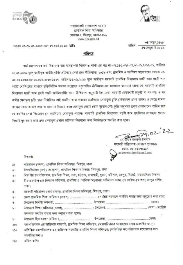 এতে বলা হয়েছে, সরকারি প্রাথমিক বিদ্যালয়ে দপ্তরী কাম প্রহরী পদটি আউটসোর্সিং পদ। নীতিমালা অনুযায়ী এটি কোনো সরকারী বেদতধারী চাকরি বা পদ নয়। এসব কর্মীদের সেবামূল্য চুক্তি দ্বারা নির্ধারিত। তাই যতদিন কাজ করবেন ততদিন সেবামূল্য চুক্তি মোতাবেক প্রাপ্য হবেন। এ ক্ষেত্রে মামলা বা অন্য কোনো কারণে কাজ বা সেবা না দিয়ে থাকলে সেবামূল্য দেয়ার কোনো সুযোগ নেই। চুক্তি অনুসারে প্রকৃত সেবাদানের তারিখ হতে যে কয়দিন সেবা দিয়েছেন সে কয়দিনের সেবামূল্য পাবেন।