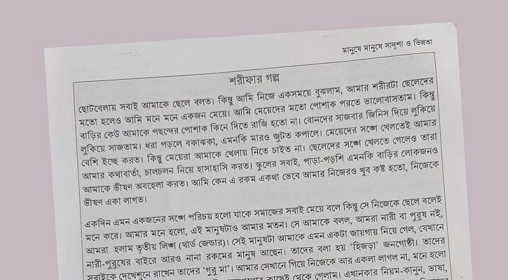 ‘ওরা এত দিন জানত, মানুষ ছেলে হয় অথবা মেয়ে হয়। এখানেও যে বৈচিত্র্য থাকতে পারে, সে কথা ওরা কখনো শোনেনি, ভাবেওনি। কিন্তু শরীফা আলাদা রকম বলে সবাই তাকে দূরে সরিয়ে দিয়েছে, এমনকি তার পরিবারের লোকেরাও! শরীফার জীবনকাহিনি শুনে সবার মন এমন বিষাদে ভরে গেল যে তাকে আর বেশি প্রশ্ন করতেও ইচ্ছে করল না।‘