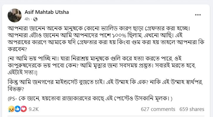আটকের চার ঘণ্টা আগে সামাজিক যোগাযোগ মাধ্যমে একটি পোস্ট দিয়েছেন আসিফ মাহতাব। তাতে তিনি বলেন-