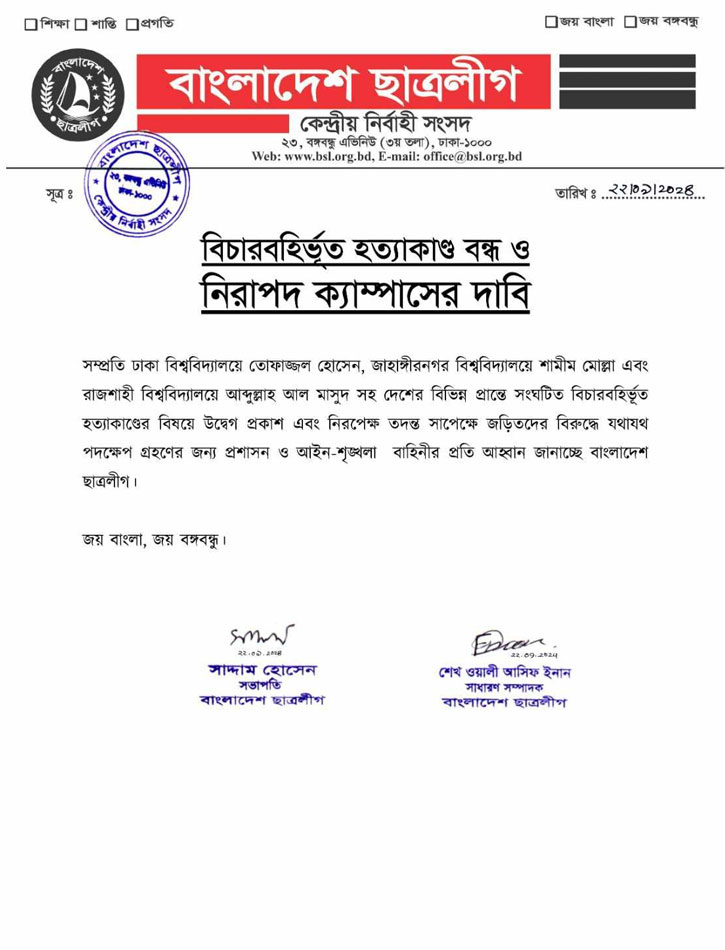 সংবাদ বিজ্ঞপ্তিতে বলা হয়, সম্প্রতি ঢাকা বিশ্ববিদ্যালয়ে তোফাজ্জল হোসেন, জাহাঙ্গীরনগর বিশ্ববিদ্যালয়ে শামীম মোল্লা এবং রাজশাহী বিশ্ববিদ্যালয়ে আব্দুল্লাহ আল মাসুদ সহ দেশের বিভিন্ন প্রান্তে সংঘটিত বিচারবহির্ভূত হত্যাকাণ্ডের বিষয়ে উদ্বেগ প্রকাশ এবং নিরপেক্ষ তদন্ত সাপেক্ষে জড়িতদের বিরুদ্ধে যথাযথ পদক্ষেপ গ্রহণের জন্য প্রশাসন ও আইন-শৃঙ্খলা বাহিনীর প্রতি আহ্বান জানাচ্ছে বাংলাদেশ ছাত্রলীগ।
