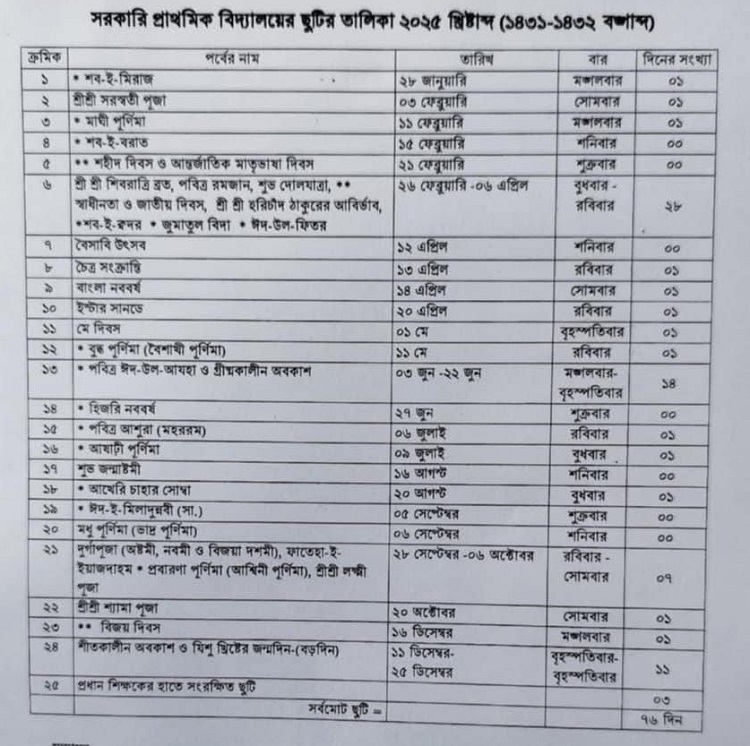 ঢাকা: সরকারি প্রাথমিক বিদ্যালয়ের ২০২৫ শিক্ষাবর্ষের বাৎসরিক ছুটির তালিকা প্রকাশ করা হয়েছে। এতে সাপ্তাহিক ছুটির বাইরে স্কুল বন্ধ থাকবে ৭৬ দিন।