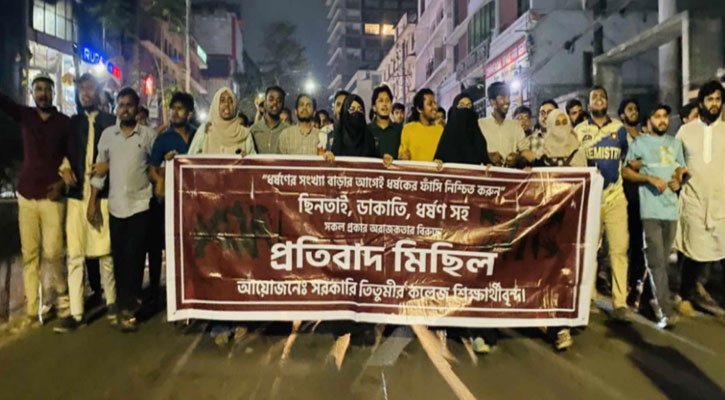 ঢাকা: সারাদেশে মাত্রাতিরিক্ত ধর্ষণের বিরুদ্ধে এবং ধর্ষকদের শাস্তির দাবিতে রাজধানীর সরকারি তিতুমীর কলেজ সাধারণ শিক্ষার্থীদের ব্যানারে বিক্ষোভ মিছিল অনুষ্ঠিত হয়েছে।