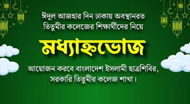 ঢাকা: পবিত্র ঈদুল আজহাকে কেন্দ্র করে বাংলাদেশ ইসলামী ছাত্রশিবির, সরকারি তিতুমীর কলেজ শাখা ঢাকায় অবস্থানরত তিতুমীর কলেজের শিক্ষার্থীদের জন্য ঈদের দিনে মধ্যাহ্নভোজের আয়োজন করতে যাচ্ছে। এতে মুসলিম শিক্ষার্থীদের পাশাপাশি ভিন্ন ধর্মাবলম্বী শিক্ষার্থীদের জন্যও রয়েছে বিশেষ ব্যবস্থা।