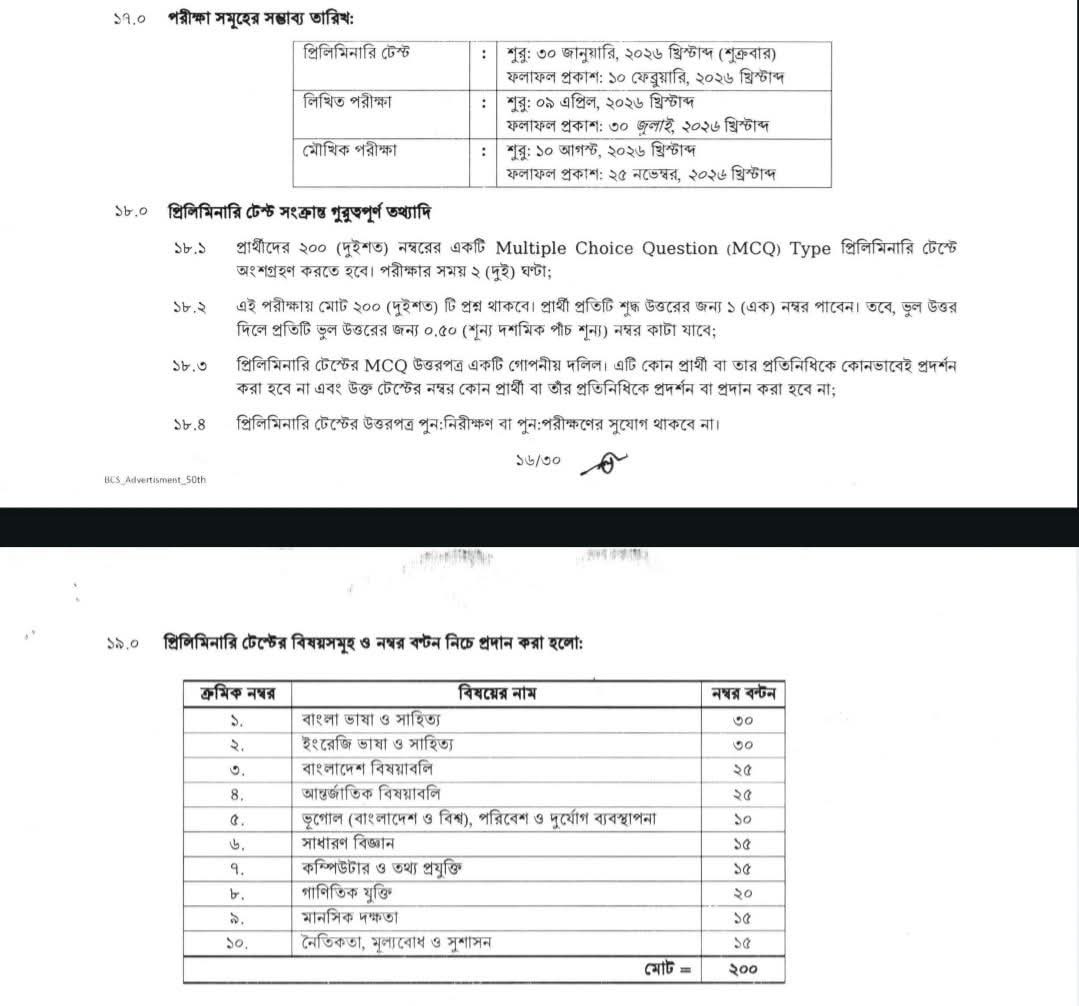 বিজ্ঞপ্তিতে জানানো হয়েছে, ৫০তম বিসিএসের প্রিলিমিনারি পরীক্ষা অনুষ্ঠিত হবে ২০২৬ সালের ৩০ জানুয়ারি। লিখিত পরীক্ষা শুরু হবে ৯ এপ্রিল এবং মৌখিক পরীক্ষা শুরু হবে ১০ আগস্ট।