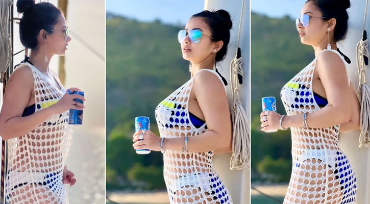ঢাকা : সমুদ্রের সঙ্গে রংমিলান্তি নীল বিকিনি, সাদা কুরুশের কাজ করা লং ড্রেস। চুলে আলগা হাত খোঁপা উঁচু করে বাঁধা। হাতে সোডা, চোখে নীল রোদচশমা। ফুকেতের সমুদ্রপাড়ে এই রূপেই আঁচ ছড়ালেন অভিনেত্রী মনামী ঘোষ।