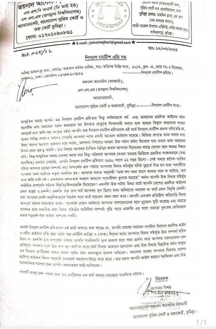 এ বিষয়ে লিগ্যাল নোটিশ পাঠানো আইনজীবী জয়নাল আবেদীন মাযহারী বলেন, ২০১০ সালে অভিনেত্রী সাদিয়া জাহান প্রভার যে স্ক্যান্ডাল ভাইরাল হয়েছিল, তিনি সেই সময় সেটার বিপরীতে কোনো আইনের আশ্রয় নেননি। ঘটনা সত্য না কি মিথ্যা বিষয়টি জনসম্মুখে ক্লিয়ার করেননি। দীর্ঘদিন পর, সম্প্রতি গণমাধ্যমে সেই বিষয়ে তিনি ঘটনার স্বীকারোক্তি দিয়েছেন এবং তার প্রেমিক অসৎ উদ্দেশ্যে সেই স্ক্যান্ডাল ভাইরাল করেন মর্মে ঘটনার সত্যতা স্বীকার করেন।