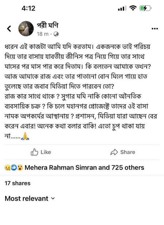 পরীমণি আরও লেখেন, ‘রাজ কার সঙ্গে থাকে? সুগার মমি নাকি কোনো অনৈতিক ব্যবসায়িক চক্র? কি চলে মহানগর প্রোজেক্টে তাদের ওই বাসা নামক অপকর্মের আস্থানায়? প্রশাসন, মিডিয়া যারা আছেন বের করেন এবার! অনেক কথা বলার বাকি! এত চুপ থাকা যায় না।’