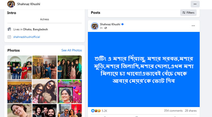 রোববার বিকালে নিজের ভেরিফায়েড ফেসবুক পেজে এই অভিনেত্রী লেখেন, শুটিংয়ে মশার পিঁয়াজু, মশার শরবত, মশার মুড়ি, মশার জিলাপি, মশার ঘুগনি, এখন মশা মিলিয়ে চা খাব! এভাবেই বেঁচে থেকে আবার ভোট দেব!
