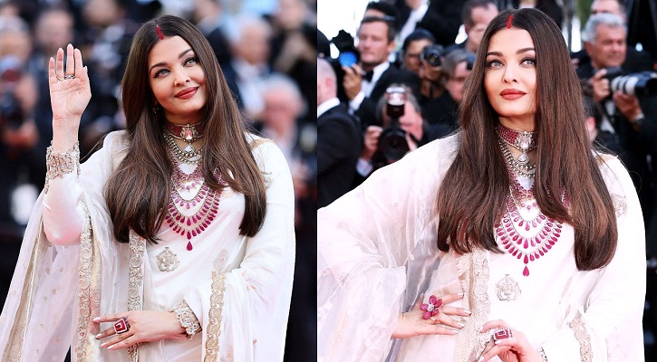 ঢাকা: পরনে দুধসাদা ও সোনালির মিশেলে তৈরি ডিজাইনার শাড়ি। গলায় রুবি পাথরের হার। কানের মঞ্চে বরাবরের মতো এবারও চোখ ধাঁধানো রূপে ঐশ্বরিয়া। তবে সাজপোশাক নয়, এবার নজর কাড়ল অন্য কিছু। আর তা হলো মাথা ভর্তি সিঁদুর।