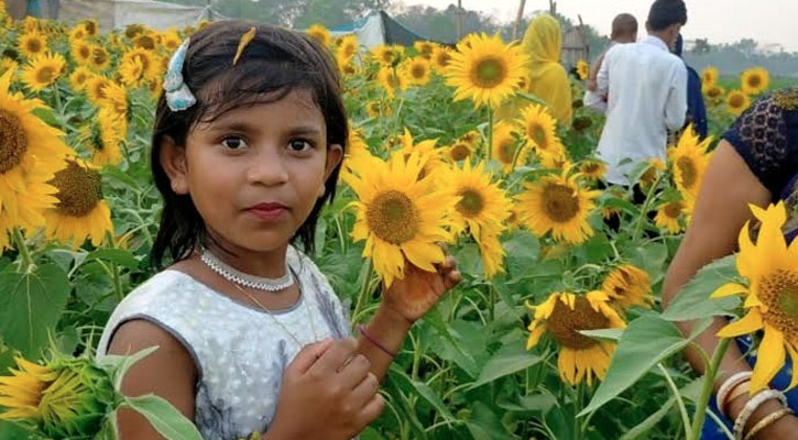 সূর্যমুখীর হাসিতে নজর কেড়েছে ফুল প্রেমিদের। দিগন্তজুড়ে সূর্যমুখী ফুলের হাসি চোখে শান্তির পরশ বুলিয়ে দেয়। এ ফুল দেখতে আর সূর্যমুখী বাগানে নিজেদের ছবি, সেলফি তুলতে নানা বয়সী সৌন্দর্যপিপাসু মানুষ প্রায় প্রতিদিন ভিড় করছেন।