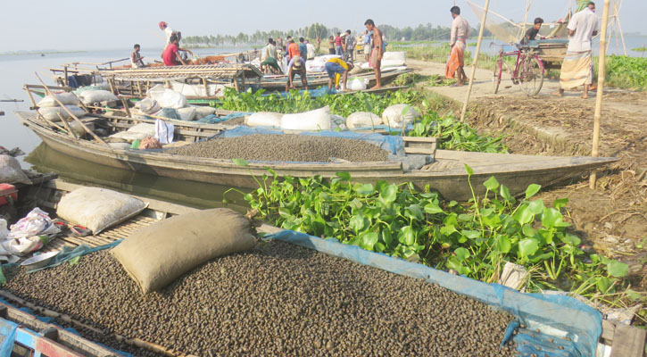 সরেজমিন শামুকের হাটে গিয়ে দেখা যায়, রাস্তার পাশে রাখা হয়েছে নৌকা, আর সেখানে শতাধিক বস্তা শামুক। ফড়িয়া ও সংগ্রহকারীদের কাছ থেকে বস্তা হিসেবে শামুক কিনে নিচ্ছেন আড়ৎদাররা। আড়ৎদারের কাছে শামুক বিক্রি করতে আসা ফড়িয়া তাড়াশ উপজেলার সগুনা গ্রামের সজিব হোসেন বলেন, এলাকার দরিদ্র ছেলেমেয়েরা শামুক-ঝিনুক ধরে। অনেক গরীব মানুষ বর্ষার দিনে কাজ না থাকায় শামুক ধরে বিক্রি করে।
