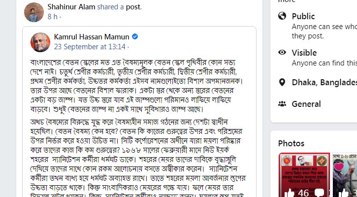 ঢাকা: বাংলাদেশের বেতন স্কেলের মত এত বৈষম্যমূলক বেতন স্কেল পৃথিবীর কোন সভ্য দেশে নাই। চতুর্থ শ্রেণীর কর্মচারী, তৃতীয় শ্রেণীর কর্মচারী, দ্বিতীয় শ্রেণীর কর্মচারী, প্রথম শ্রেণীর কর্মকর্তা, উচ্চতর কর্মকর্তা এইসব নামগুলোইতো বিশাল অপমানজনক। তার উপর আছে বেতনের বিশাল ফারাক। একটা স্তর থেকে অন্য স্তরের বেতনের একটা বড় জাম্প। যত উচ্চ স্তরে যাব এই জাম্পগুলো পরিমানও লাফিয়ে লাফিয়ে বাড়বে। শুধুই বেতনের জাম্প না একই সাথে সুবিধারও জাম্প আছে।অথচ বৈষম্যের বিরুদ্ধে যুদ্ধ করে বৈষম্যহীন সমাজ গঠনের জন্য দেশটা স্বাধীন হয়েছিল। বেতন বৈষম্য কেন হবে?