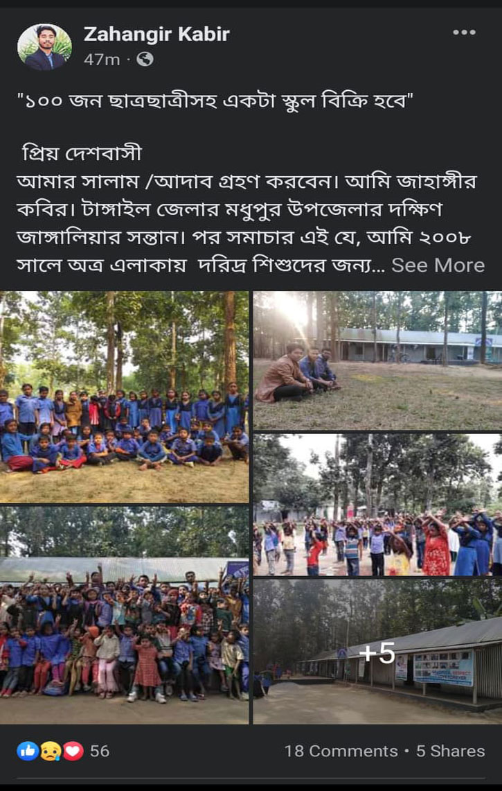 মঙ্গলবার (১৬ স্কুলটি বিক্রি করা জন্য ফেসবুকে স্ট্যাটাস দিয়েছেন জাহাঙ্গীর কবির।