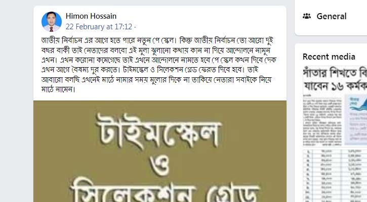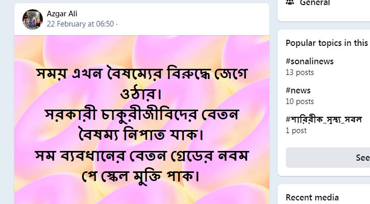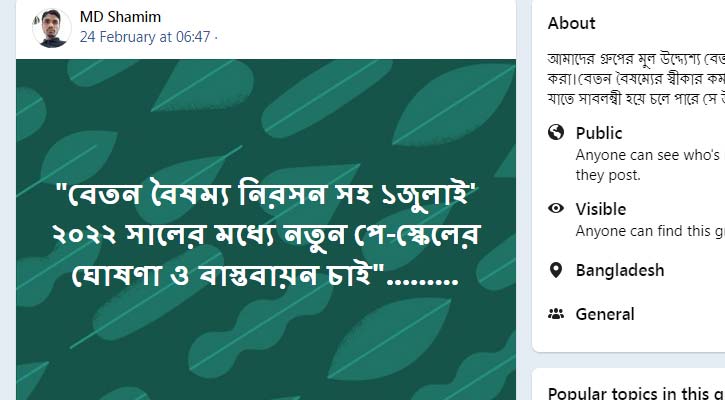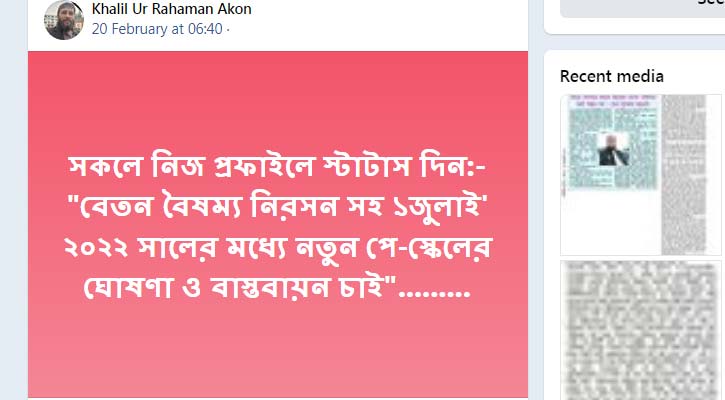 একজন লিখেছেন, "বেতন বৈষম্য নিরসন সহ ১জুলাই' ২০২২ সালের মধ্যে নতুন পে-স্কেলের ঘোষণা ও বাস্তবায়ন চাই".........
